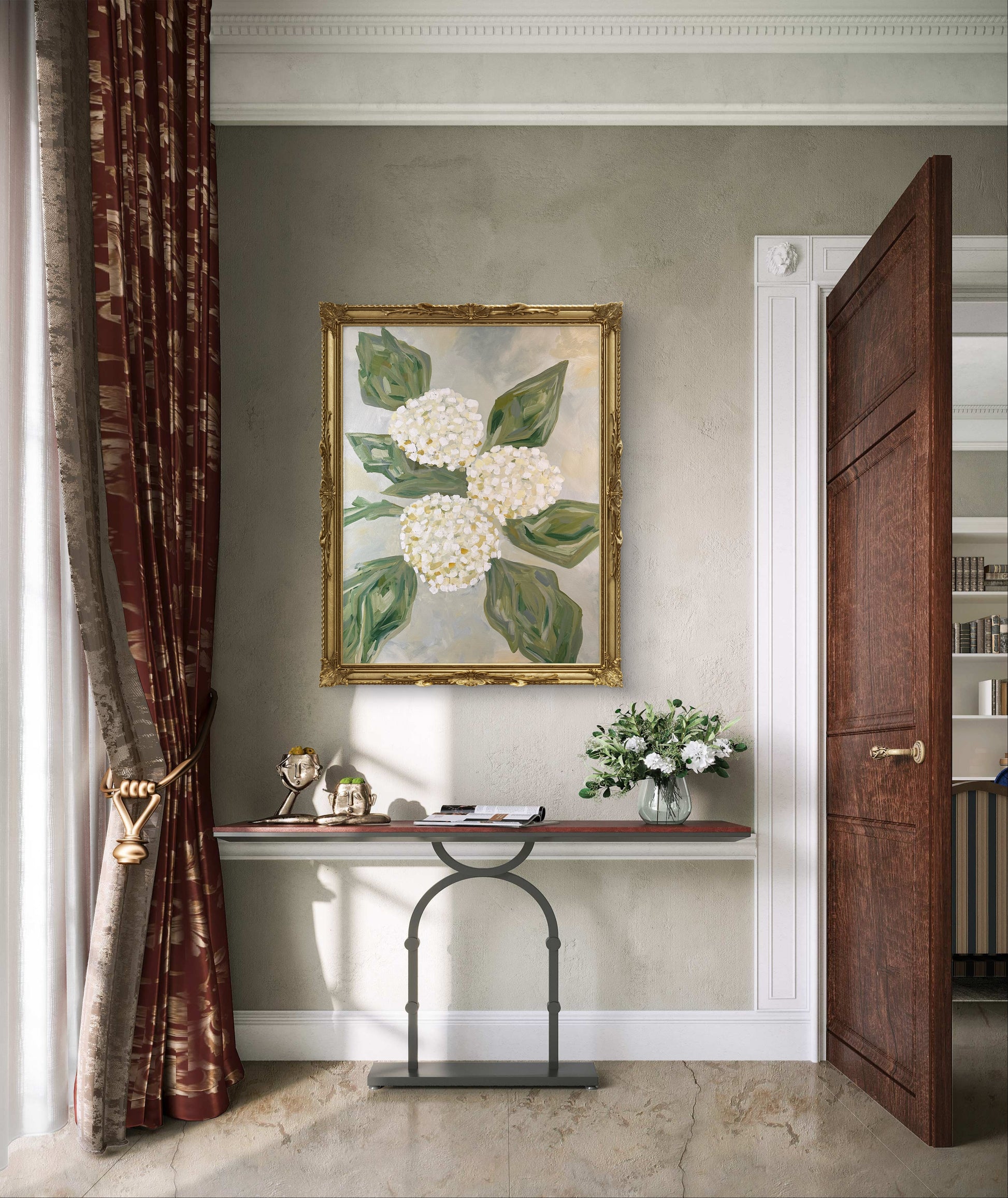 The three hydrangeas and surrounding leaves became symbols of that quiet, anchoring wisdom. They represent the beauty that can grow even in unknown, difficult seasons. This piece is a reminder to take heart and hold onto joy — not because the journey is always easy, but because He is in control. The One who formed you already knows the ending to your story, even before the beginning.