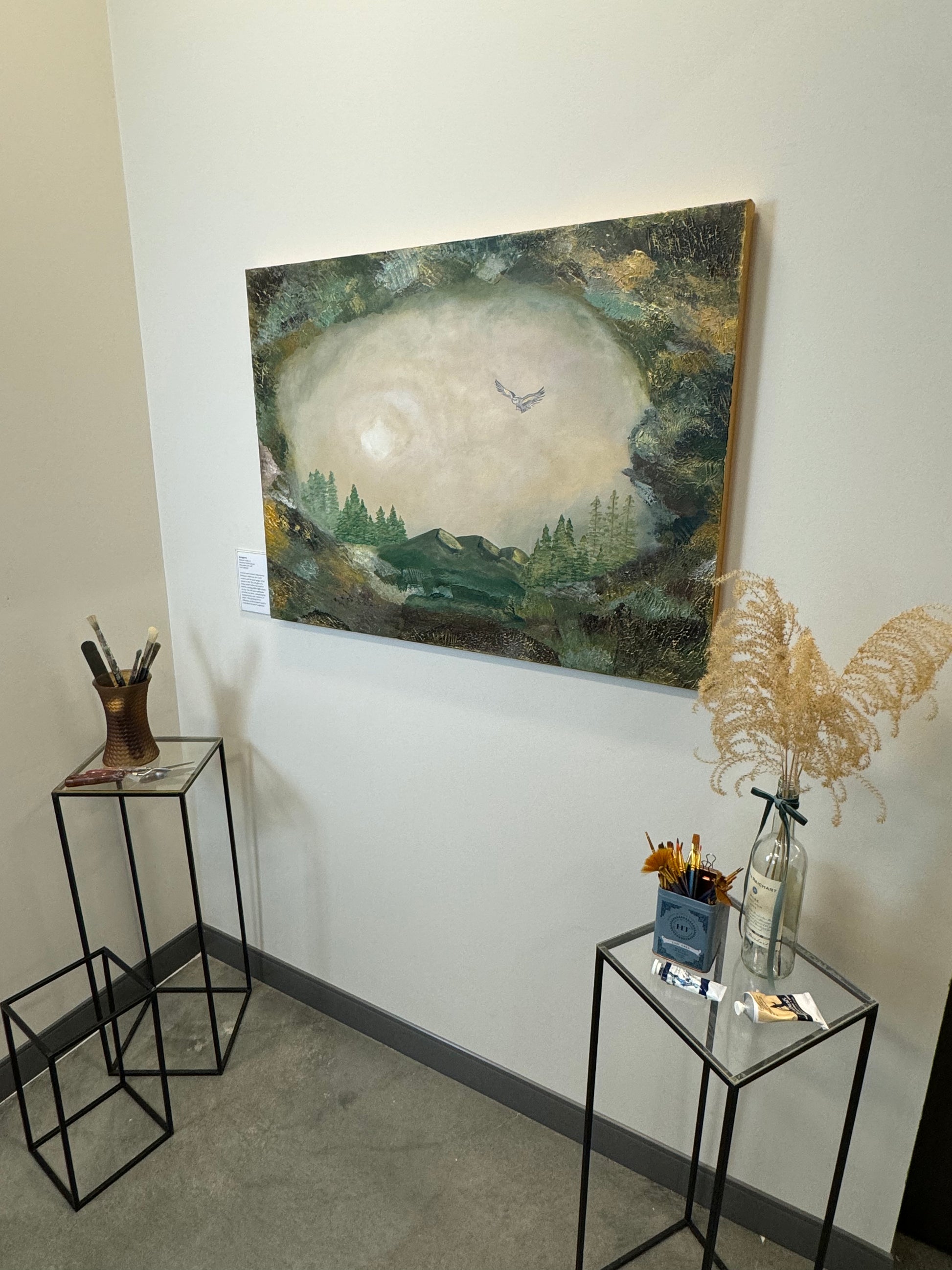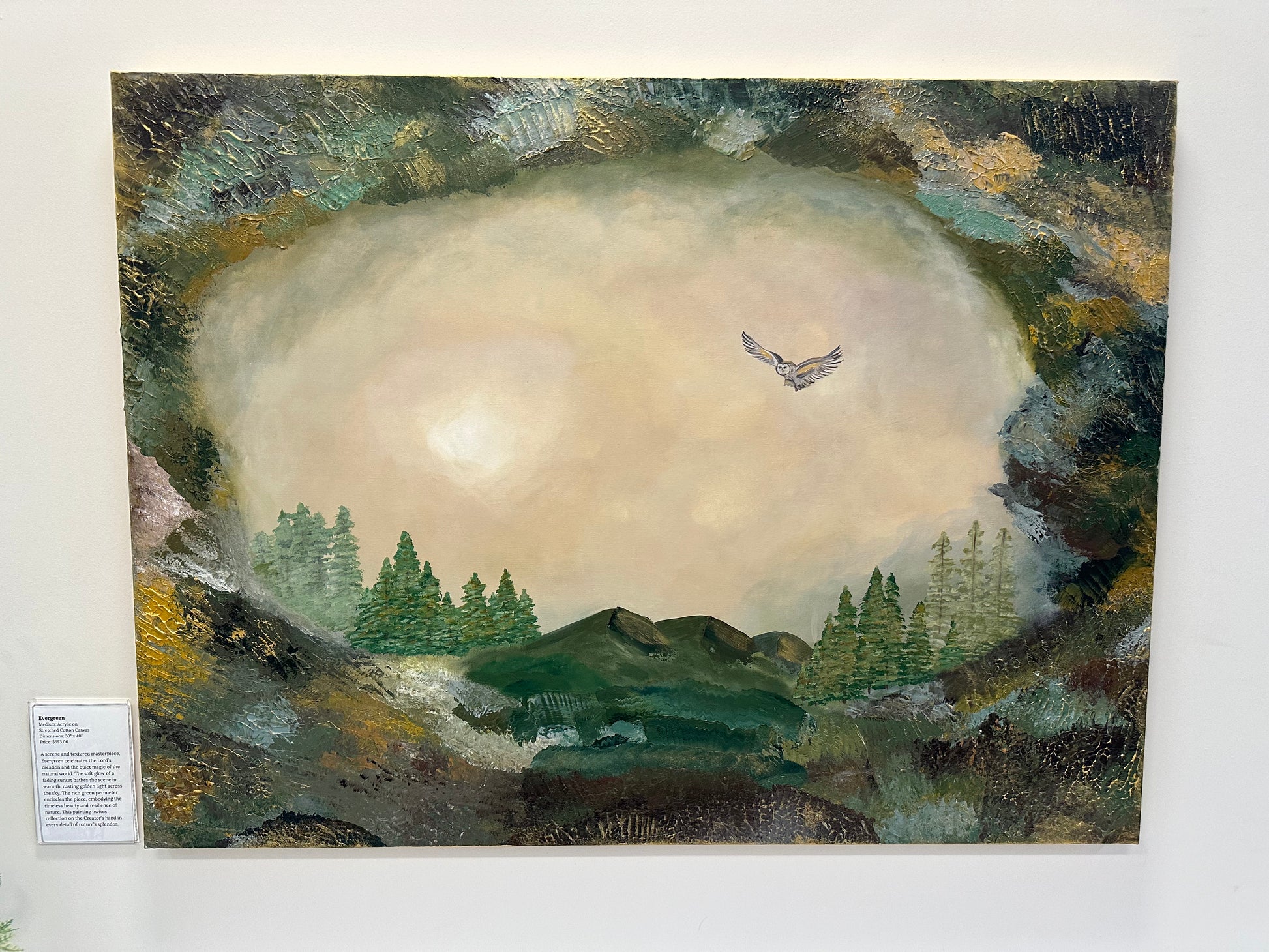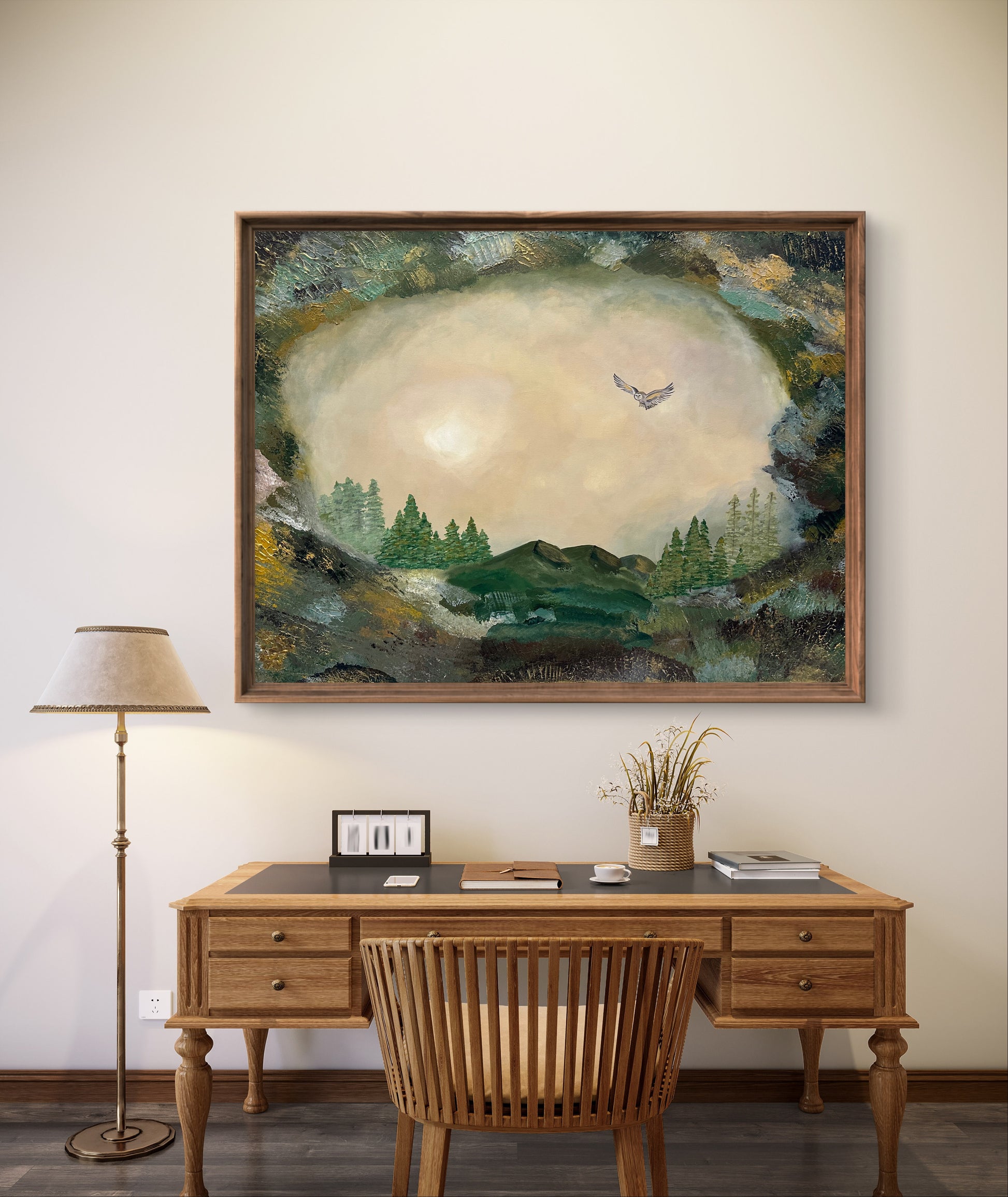 A serene and textured masterpiece, Evergreen celebrates the Lord's creation and the quiet magic of the natural world. The soft glow of a fading sunset bathes the scene in warmth, casting golden light across the sky. The rich green perimeter encircles the piece, embodying the timeless beauty and resilience of nature. This painting invites reflection on the Creator's hand in every detail of nature's splendor.