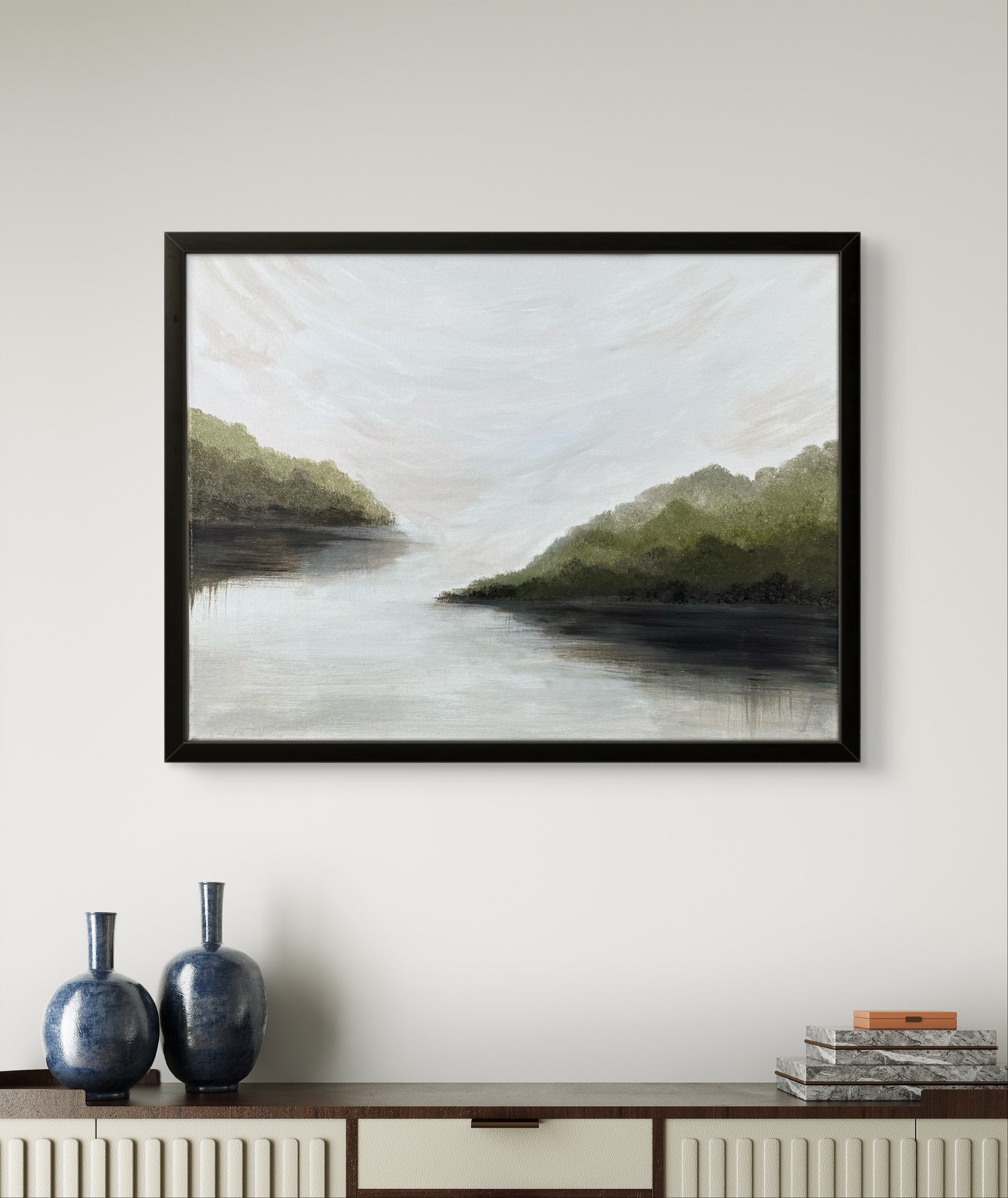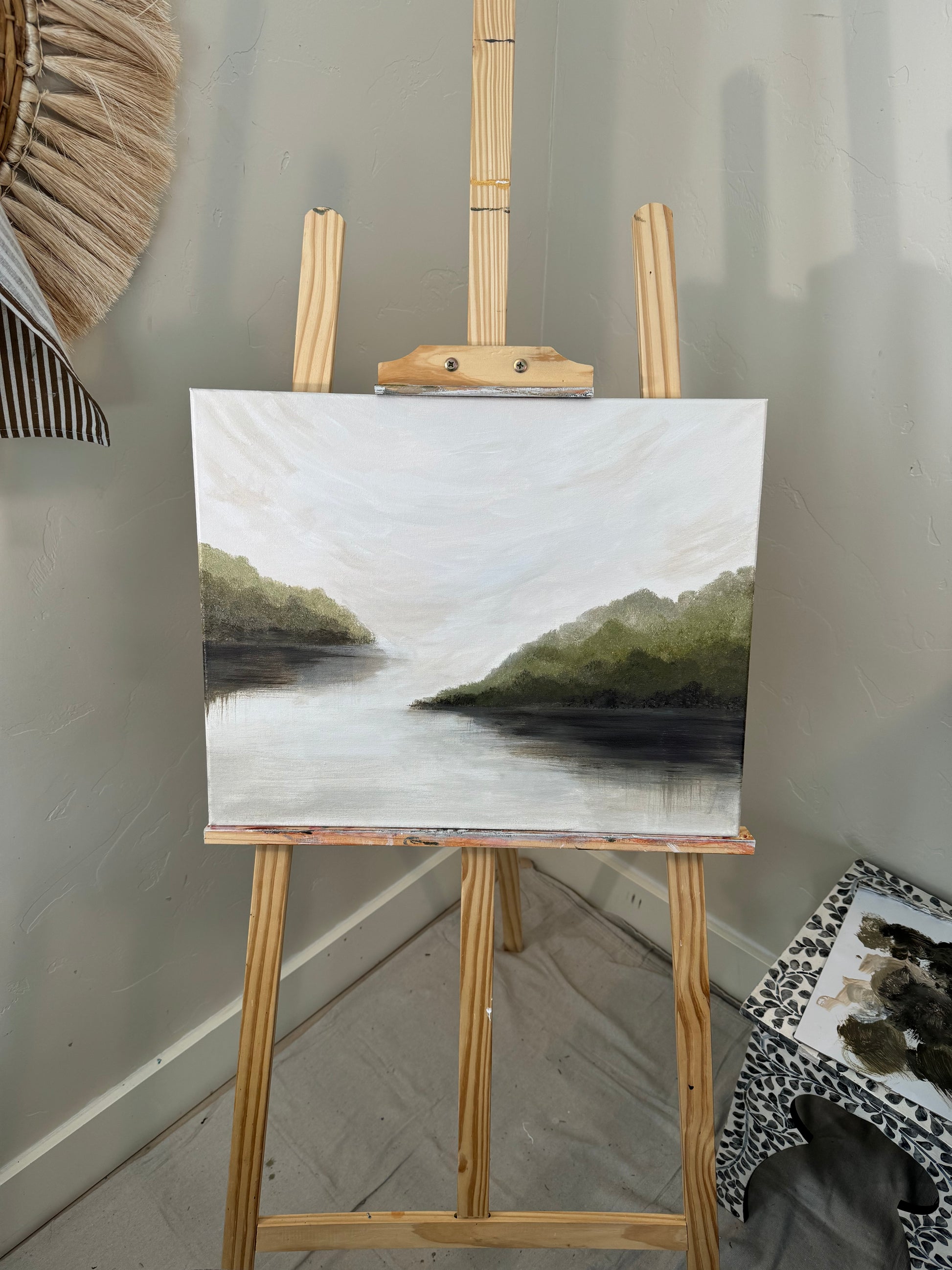 “Misty Morning” captures the quiet serenity of a foggy dawn, where the world feels still and time slows. Soft mist drapes over the water, inviting you to sit by the creek, breathe in the crisp morning air, and savor a warm cup of coffee. Let this painting transport you to a peaceful moment of reflection and solitude.