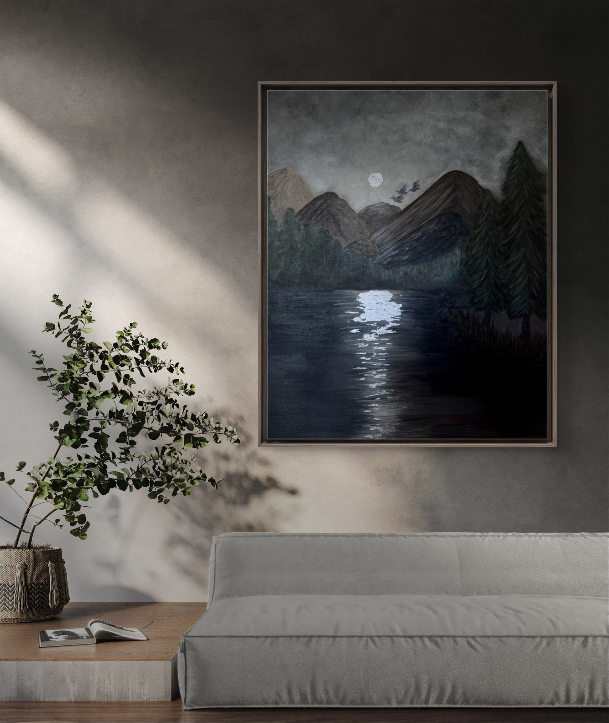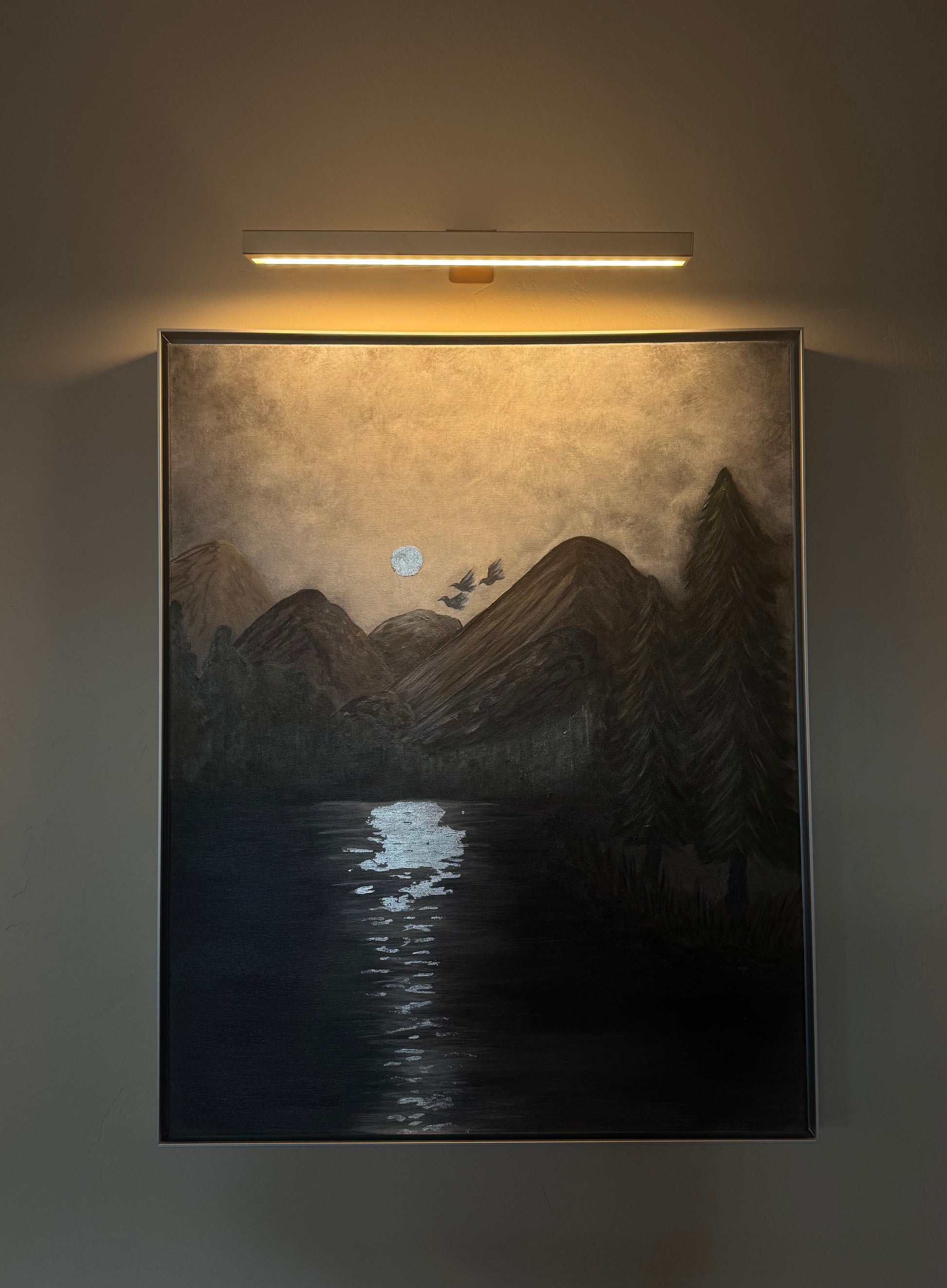 • Medium: Acrylic on grandeur cotton canvas with silver metallic leaf set in a silver metal frame